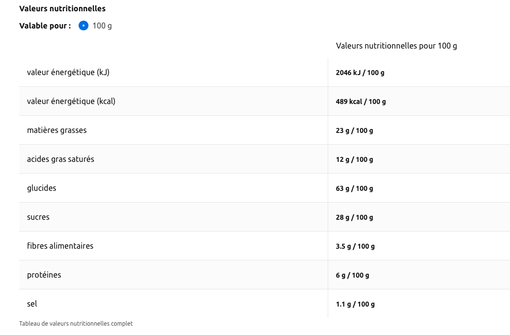 Farine de BLÉ 37 %, sucre, graisses végétales (palme, karité en proportion variable), farine complète de BLÉ 13 %, pâte de cacao, lactosérum en poudre (de LAIT), LAIT écrémé en poudre, sirop de sucre brut, poudres à lever (carbonates de sodium, carbonates d'ammonium), BEURRE concentré, sel, correcteur d'acidité (acide citrique), émulsifiants (lécithines de SOJA, E476), lactose (de LAIT), arôme. PEUT CONTENIR FRUITS A COQUE.